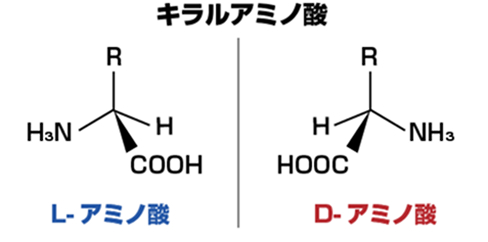 アミノ酸には、互いに鏡像関係にある D-体と L-体(キラルアミノ酸)が存在し、それぞれは生体内で固有の機能や代謝経路を担っています。