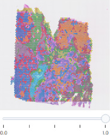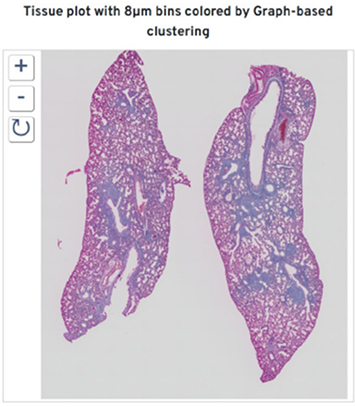 Visium v2で取得したデータは、専用ソフトウェアSpace Rangerにより前処理・解析され、その結果をLoupe Browser 9.0上で直感的に可視化できます。ライブラリ調製前に組織切片をH&E染色し、その画像を遺伝子発現マップと重ね合わせることで、形態学的特徴(組織構造や細胞の分布)と分子情報(遺伝子発現パターン)を統合的に比較可能です。これにより、例えば特定の細胞集団の局在や、病変部と周辺部の遺伝子発現差異を明確に捉えることができます。(Fig.3)(Fig.4)(Fig.5)