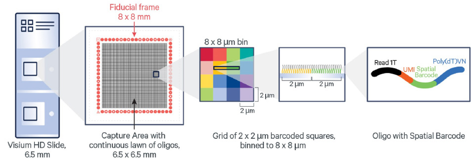 Visium HD専用スライドには、6.5 × 6.5 mmのキャプチャーエリアが2領域搭載されており、それぞれの領域には約1,100万個の2 × 2 µmサイズの正方形グリッドが敷き詰められています。各グリッドには固有のバーコードを持つオリゴヌクレオチドが配置されており、これにより単一細胞レベルに迫る空間分解能での遺伝子発現解析が可能になります。(Fig.2)