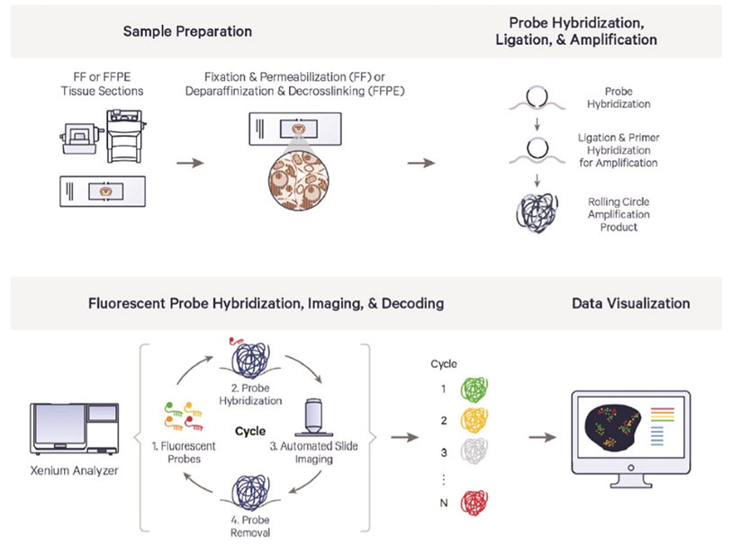 Xeniumでは、Padlock probeと呼ばれる、標的遺伝子配列に相補的な配列を両端に持つ南京錠型プローブを使用します。ターゲットmRNAに正確にハイブリダイズしたプローブのみが、両端のライゲーションにより環状構造を形成します。この環状プローブに対してRolling Circle Amplification(RCA)を行うことで、蛍光色素結合配列を多数含む長鎖DNAが生成され、高感度かつ高特異的な検出が可能となります。FFPEブロックから作製した組織切片スライドに対し、このPadlock probeおよびRCAケミストリーを用いることで、最大約5,000遺伝子のRNA発現を高い空間解像度で検出します。取得されたデータは、10x Genomics社提供の専用解析プラットフォーム Xenium Onboard Analysisにより、細胞セグメンテーション、遺伝子発現解析、空間可視化まで一貫して解析可能です。