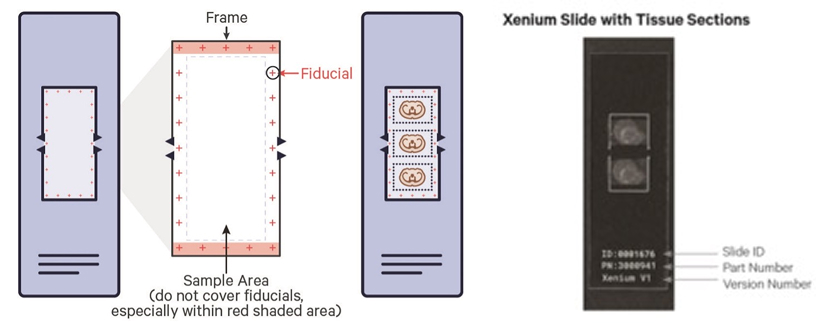 Xenium専用スライドには、235 mm2(10.45 mm x 22.45 mm)の解析領域が搭載されており、解析領域を規定する fiducial frame が設けられています。本フレームはイメージングおよび空間座標取得の基準となり、組織切片はフレーム内に配置する必要があります(Fig.2)。これにより、組織構造と遺伝子発現情報を高精度に対応付けることが可能です。